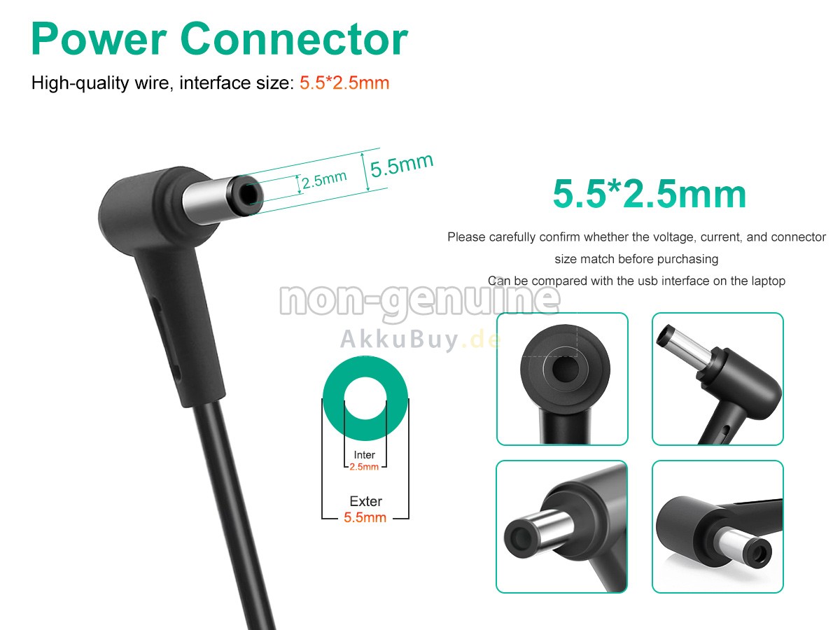 2 Passende Ausgangsspannung und -stromstärke (bzw. Leistung): Wählen Sie einen Netzteil mit gleicher oder kompatibler Ausgangsspannung und -stromstärke (bzw. Leistung) entsprechend den Spezifikationen des Originaladapter. Die Spannung sollte genau übereinstimmen oder um nicht mehr als 1 V abweichen, während die Stromstärke (oder Leistung) etwas höher, aber nicht niedriger sein kann, um ein effizientes und sicheres Laden zu gewährleisten.