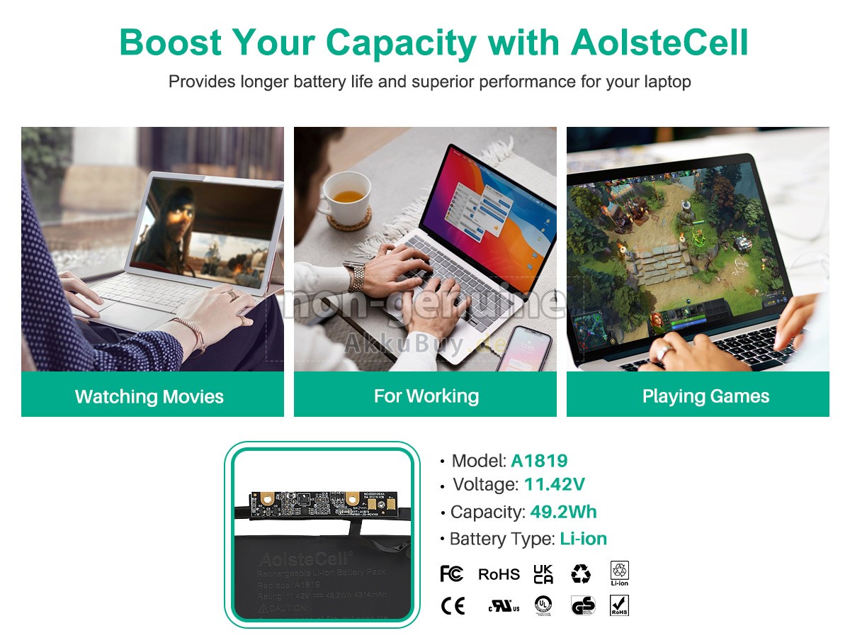 Wir betrachten Sicherheit und Qualität als unsere Pflicht. Jede Ersatzakku für Apple MacBook Pro 13 inch TOUCH A1706(Mid 2017) Laptop wurde getestet, um zu beweisen, dass sie die ursprüngliche MacBook Pro 13 inch TOUCH A1706(Mid 2017) Akku-Leistung erreichen oder übertreffen kann und 100% kompatibel mit den originalen Spezifikationen des Herstellers ist. Den internationalen Standards entsprechend haben sie eine Reihe von strengen Sicherheitszertifizierungen wie CE, UL, ROHS, ISO9001 / 9002 erhalten. Im Allgemeinen kann diese Apple MacBook Pro 13 inch TOUCH A1706(Mid 2017) Akku bis zu mehr als 600 Zyklen geladen / entladen werden.