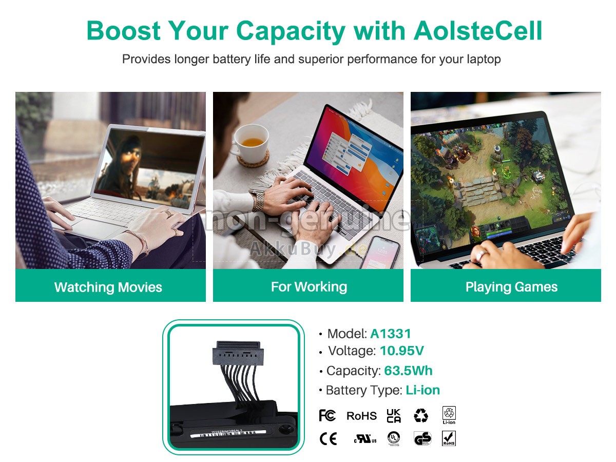 Wir betrachten Sicherheit und Qualität als unsere Pflicht. Jede Ersatzakku für Apple MacBook Unibody 13 inch A1342 (Mid 2012) Laptop wurde getestet, um zu beweisen, dass sie die ursprüngliche MacBook Unibody 13 inch A1342 (Mid 2012) Akku-Leistung erreichen oder übertreffen kann und 100% kompatibel mit den originalen Spezifikationen des Herstellers ist. Den internationalen Standards entsprechend haben sie eine Reihe von strengen Sicherheitszertifizierungen wie CE, UL, ROHS, ISO9001 / 9002 erhalten. Im Allgemeinen kann diese Apple MacBook Unibody 13 inch A1342 (Mid 2012) Akku bis zu mehr als 600 Zyklen geladen / entladen werden.