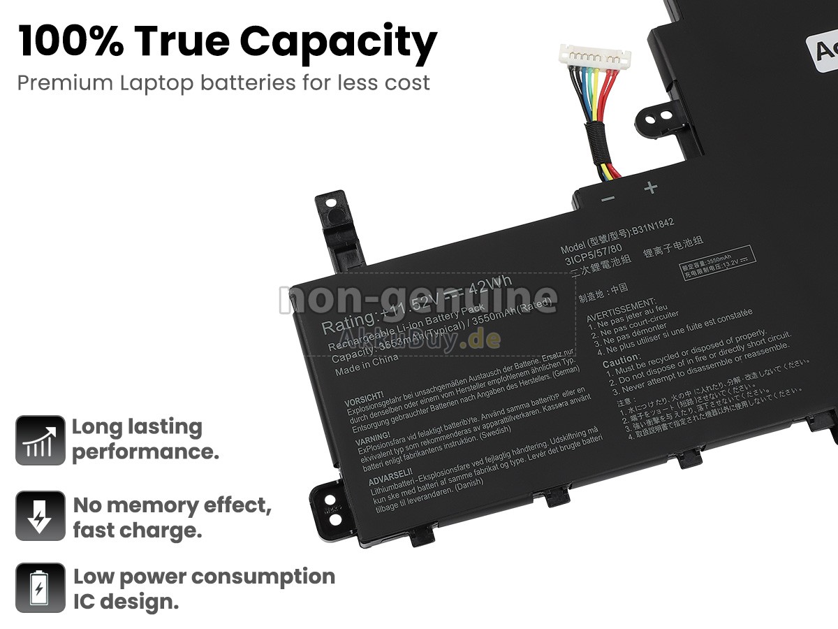 AkkuBuy.de ist Ihre beste Wahl für hochwertige Asus Laptop Akkus! Der brandneue 42Wh Asus VivoBook 15 X513EA Li-Polymer Ersatzakku wurde mit super hochwertigen Zellen von Samsung, Panasonic und LG hergestellt, um eine optimale Leistung zu gewährleisten. Das Asus VivoBook 15 X513EA Akku-Gehäuse besteht aus nicht brennbarem und haltbarem Kunststoff. Um Beschädigungen während des Transports zu vermeiden, werden sie mit mehreren Schichten dicker Luftpolsterfolie umwickelt und in eine robuste Pappschachtel gepackt.