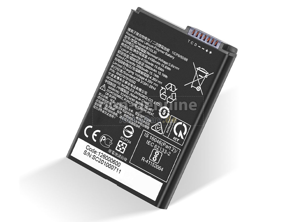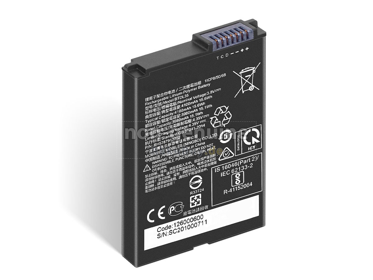 1 Nehmen Sie die Akku heraus, finden Sie die Teilenummer (z. B. „Datalogic BTDL35“), die Akkukapazität und die Akkuspannung der alten Akku auf dem Etikett heraus.