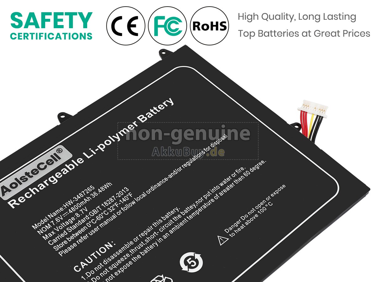 Wir betrachten Sicherheit und Qualität als unsere Pflicht. Jede Ersatzakku für Jumper HW-3487265 Laptop wurde getestet, um zu beweisen, dass sie die ursprüngliche HW-3487265 Akku-Leistung erreichen oder übertreffen kann und 100% kompatibel mit den originalen Spezifikationen des Herstellers ist. Den internationalen Standards entsprechend haben sie eine Reihe von strengen Sicherheitszertifizierungen wie CE, UL, ROHS, ISO9001 / 9002 erhalten. Im Allgemeinen kann diese Jumper HW-3487265 Akku bis zu mehr als 600 Zyklen geladen / entladen werden.