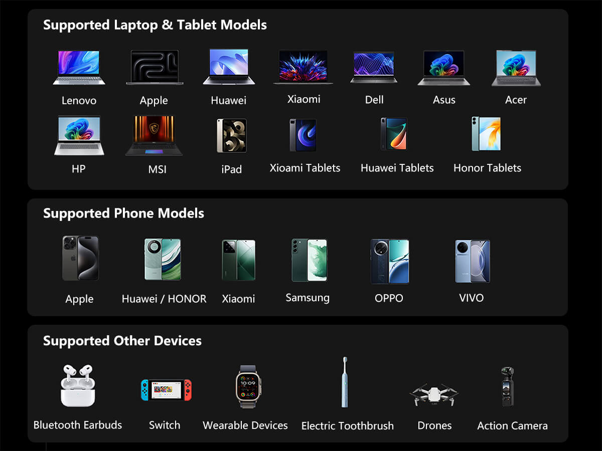 A: Die Powerbank eignet sich für eine Vielzahl von Geräten, darunter USB-C-Laptops, Tablets, Smartphones, aber auch kleinere Geräte wie Smartwatches, Bluetooth-Kopfhörer, Drohnen und Spielkonsolen.